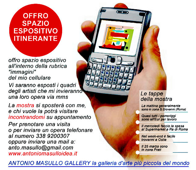 Come funziona: gli artisti inviano fotografie delle loro opere e lui… le espone sul suo telefono: se qualcuno chiede di vederle lui gli mostra il cellulare! Cavolo, uno spazio espositivo itinerante… capite? Lui lavora all’Eur, fa la spesa al supermercato, va a Ostia… conosce gente!!