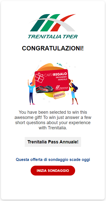 Oggi lo spammer mi scrive spacciandosi per trenitalia, poco credibile, trenitalia non ha mai regalato niente. A nessuno.