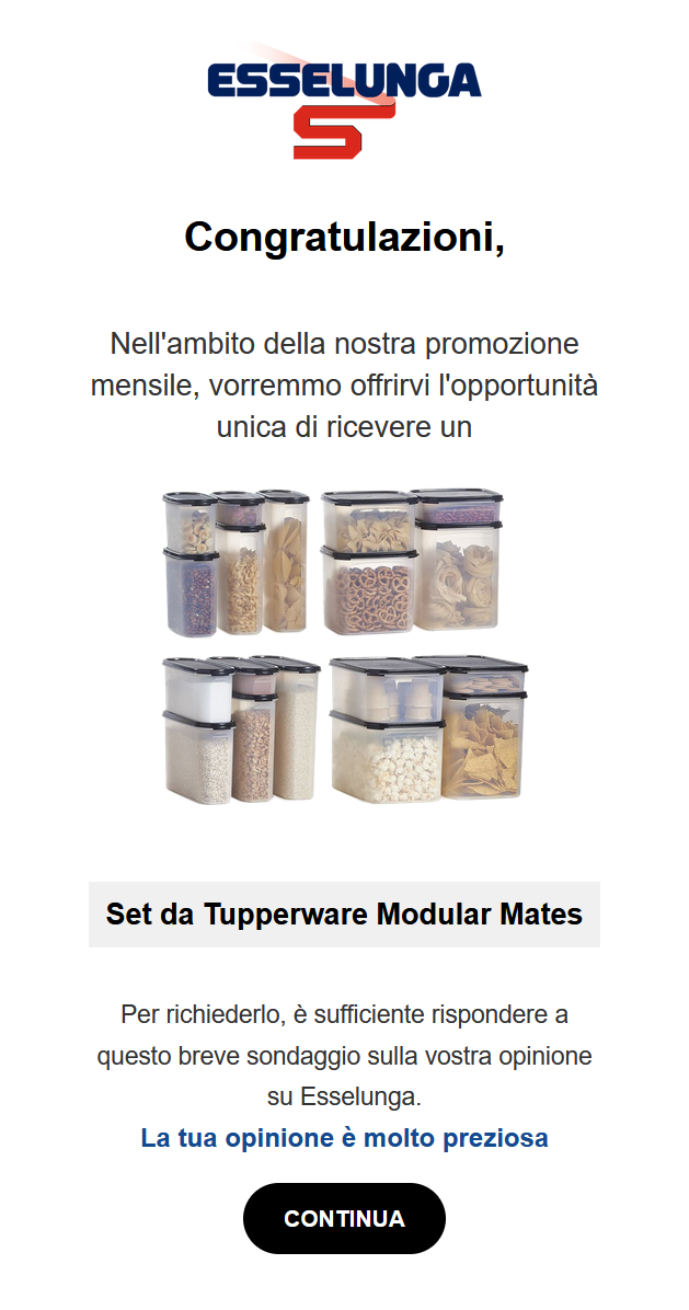 Lo spam di oggi era facilmente riconoscibile, fatto con un certo pressapochismo, molte parti nella lingua sbagliata. L’unica cosa credibile? L’immagine, con il logo di esselunga. Peccato che Esselunga non c’entri niente con questa promozione e che questa non sia una promozione ma un puro tentativo di phishing.